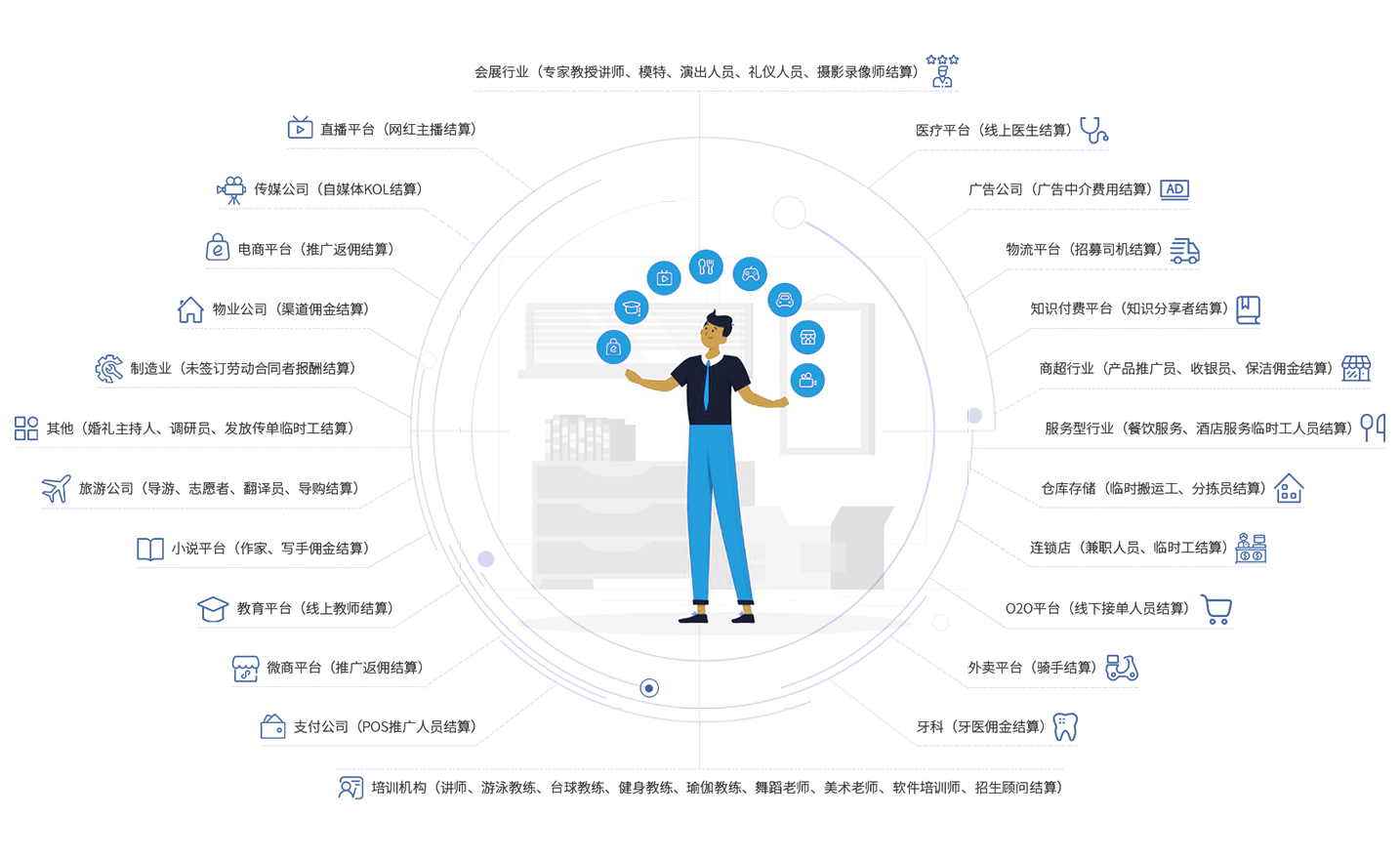◆企业与从业者签订合作协议,从业者完成企业发布的任务 ◆企业向南京文途通支付灵活用工人员的委托代发报酬及相关费用,南京文途通按收款总额(含南京文途通服务费、从业者报酬、相关税费)开具结算凭证给企业 ◆南京文途通批量申报缴纳个人所得税后,将税后报酬支付给自由职业者